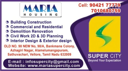- Street: Old. No.98, New. No.98/A, Bankmans Colony., Azhagiri Nagar, Alamelumangapuram, Sathuvancheri, Vellore - 632009.
