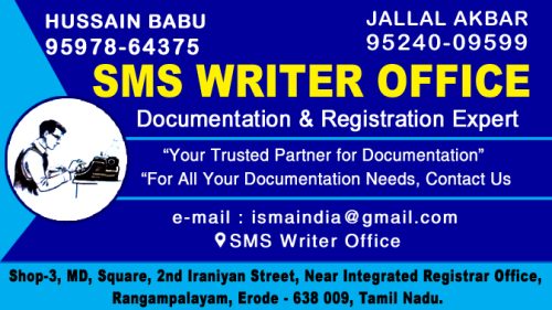 - Street: Shop-3, MD Square, 2nd Iraniyan Street, (Near : Integrated Registrar Office), Rangampalayam, Erode - 638009.
